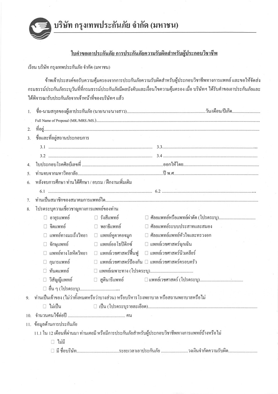 ข้าพเจ้าประสงค์ขอรับความคุ้มครองจากการประกันภัยความรับผิดสำหรับผู้ประกอบวิชาชีพทางการแพทย์ และขอให้จัดส่งกรมธรรม์ประกันภัยระบุวันที่ที่กรมธรรประกันภัยมีผลบังคับและเงื่อนไขความคุ้มครอง เมื่อ บริษัทฯ ได้รับคำขอเอาประกันภัยและได้พิจารณารับประกันภัยจากเจ้าหน้าที่ของบริษัทฯ แล้ว