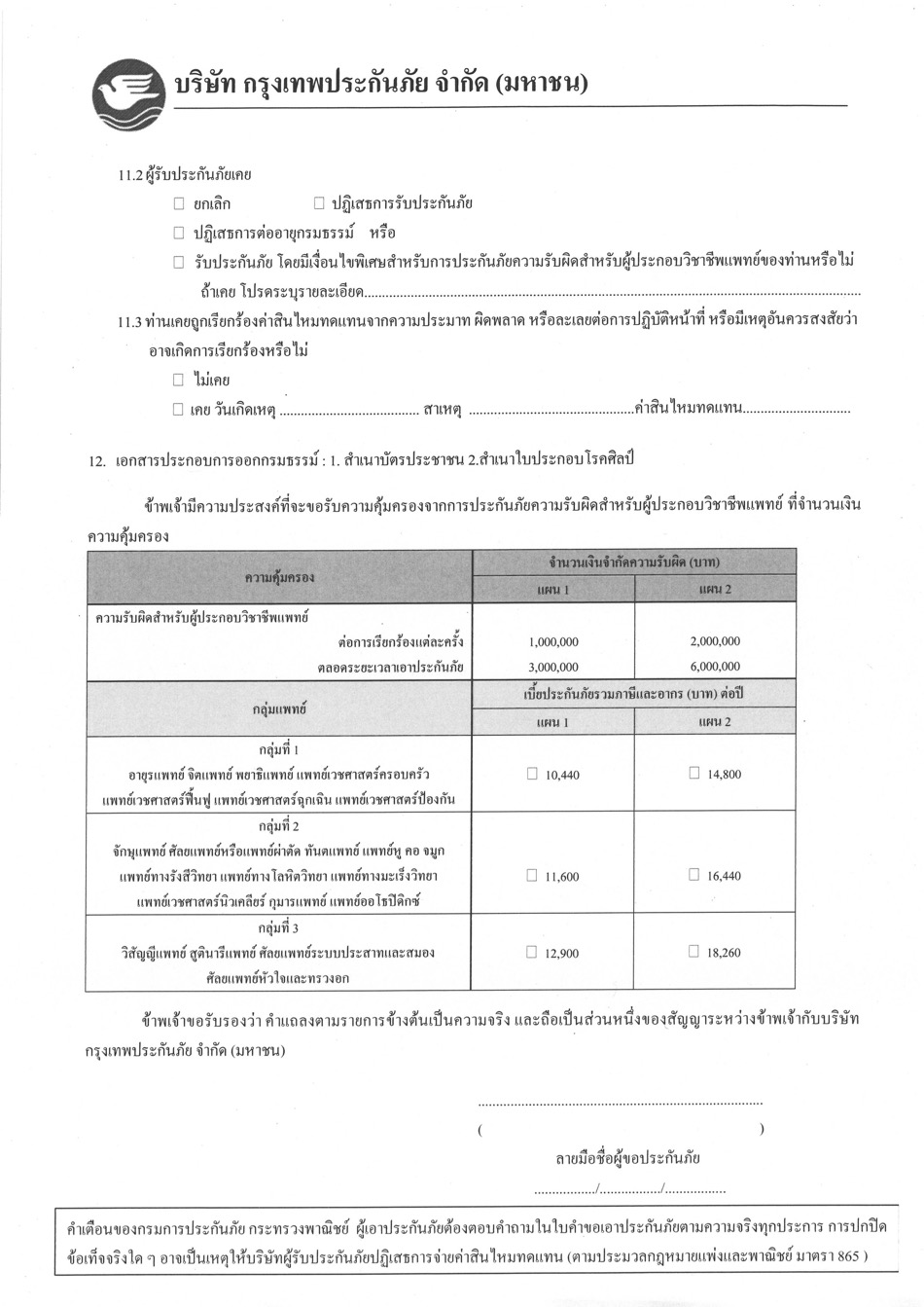 11.2 ผู้รับประกันภัยเคยยกเลิก หรือปฏิเสธการรับประกันภัย หรือ ปฏิเสธการต่ออายุกรมธรรม์ หรือ รับประกันภัย โดยมีเงื่อนไขพิเศษสำหรับการประกันภัยความรับผิดสำหรับผู้ประกอบวิชาชีพแพทย์ของท่านหรือไม่