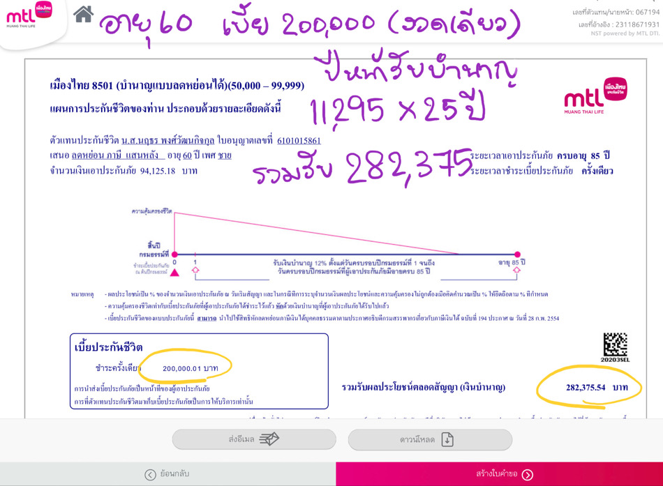 ทำแบบประกัน เมืองไทย 8501 (บำนาญลดหย่อนได้) เบี้ย 1 งวด รับบำนาญปีถัดไป