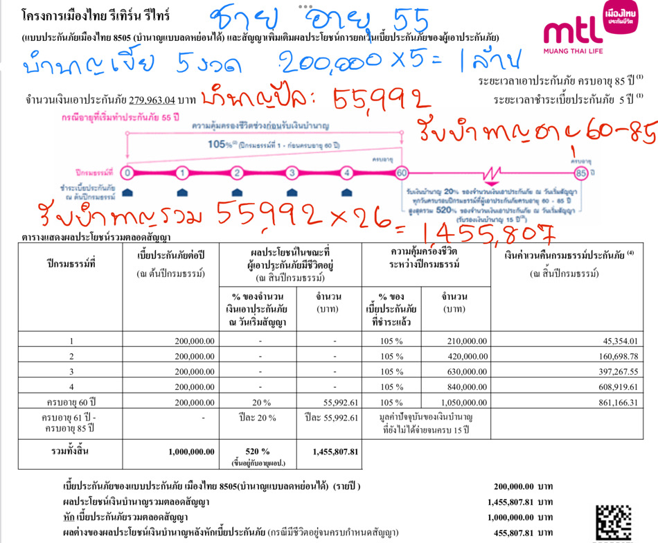ㆍ รับบำนาญปีละ 12%ของทุนประกัน คือ 12% x 279,963 = 55,992