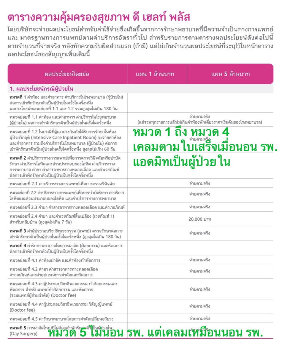 คำอธิบายตารางสรุปความคุ้มครองของ ดี เฮลท์ พลัส ( D Health Plus )