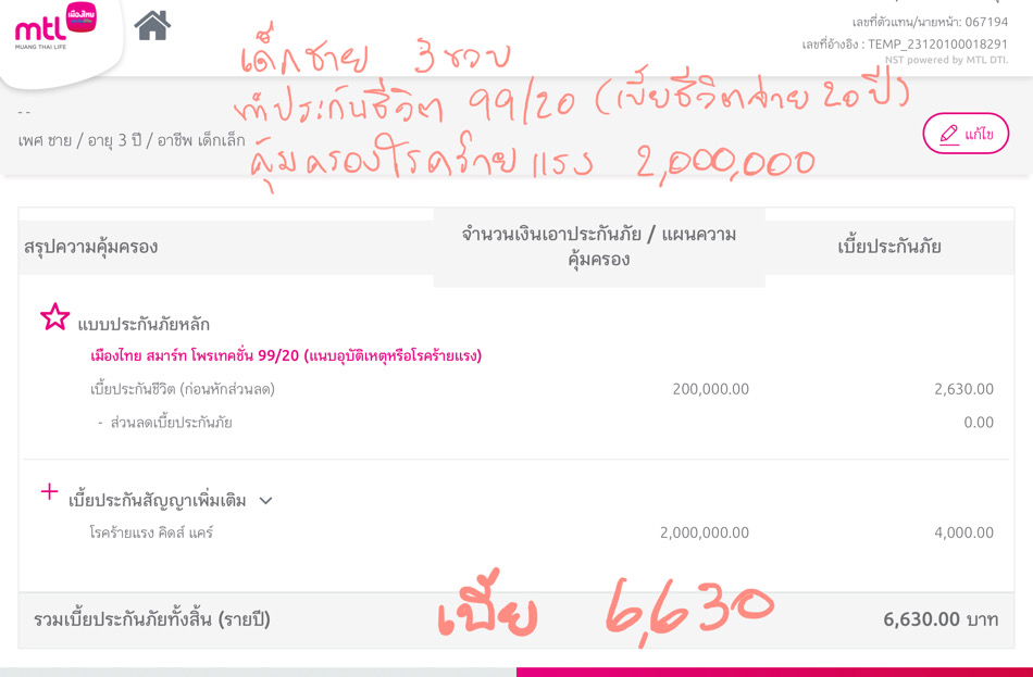 ถ้าทำ Kids Care วงเงิน 2,000,000 พร้อมกับประกันชีวิตแบบ 99/20 และอุบัติเหตุ ก รวมเบี้ยทั้งกรมธรรม์ 6,630 บาทต่อปี